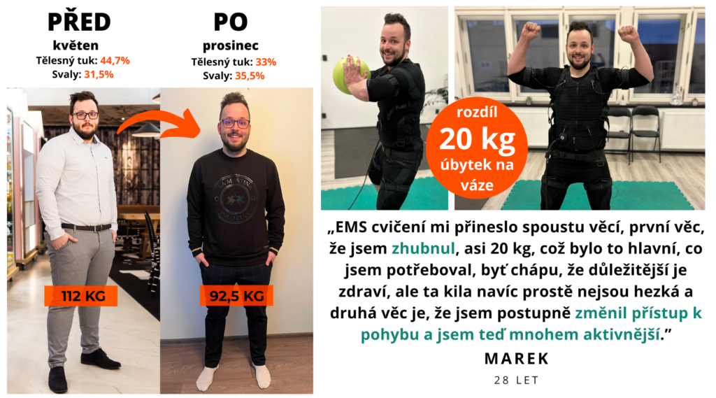 Po několika měsících pravidelných tréninků dosáhl výsledků, které překvapily nejen jeho, ale i okolí. „EMS cvičení mi přineslo spoustu věcí, první věc je, že jsem zhubnul, asi 20 kg, což je asi to největší, co jsem potřeboval. […] Druhá věc je, že jsem se odhodlal cvičit,” říká Marek, který postupně změnil přístup k pohybu a může se chlubit úžasnou proměnou. Jeho proměna není jen o číslech na váze. Podíl tělesného tuku klesl ze 44,7 % na 33 %, jeho svalová hmota naopak vzrostla. S úsměvem prezentuje také svůj nový aktivnější životní styl. Prozkoumejte celou jeho proměnu ZDE.