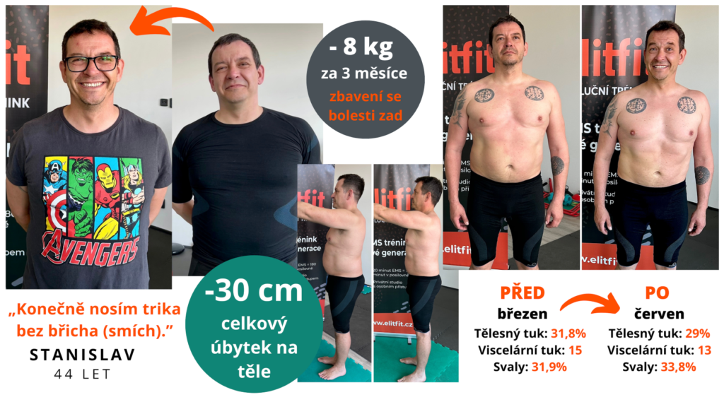 Zpevnění těla, zhubnutí a eliminace zdravotních problémů. Hlavní motivací pro Stanislava byl právě jeden velký zdravotní problém, a to dlouhodobé bolesti zad. „Už nemusím vůbec přemýšlet, jaký pohyb udělám, co zvednu,” pochvaluje si Stanislav, jehož pozitivní výsledky se dostavily již po měsíci, tedy čtyřech trénincích, neboť EMS cvičení stačí navštěvovat jednou týdně na 20 minut.