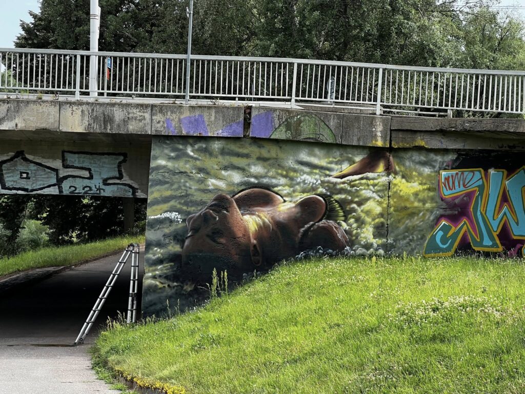Tento čtvrtek se na stejném pilíři mostu U Soutoku objevila nová malba od JW17. Tentokrát už legálně, v rámci oficiálně povolených graffiti ploch. Nový mural tematicky navazuje na původní dílo, opět jde o ženskou postavu ve vodní hladině, ale ztvárnění je civilnější, střídmější a méně provokativní.