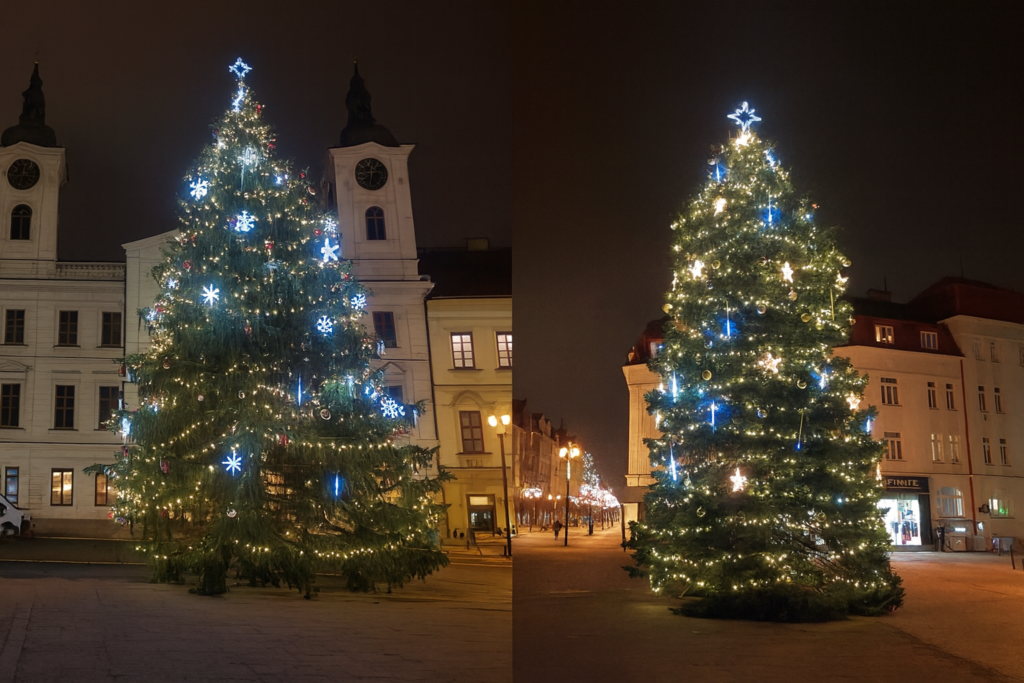 ANKETA: Svítící vánoční stromy na náměstích. Který se vám líbí víc?