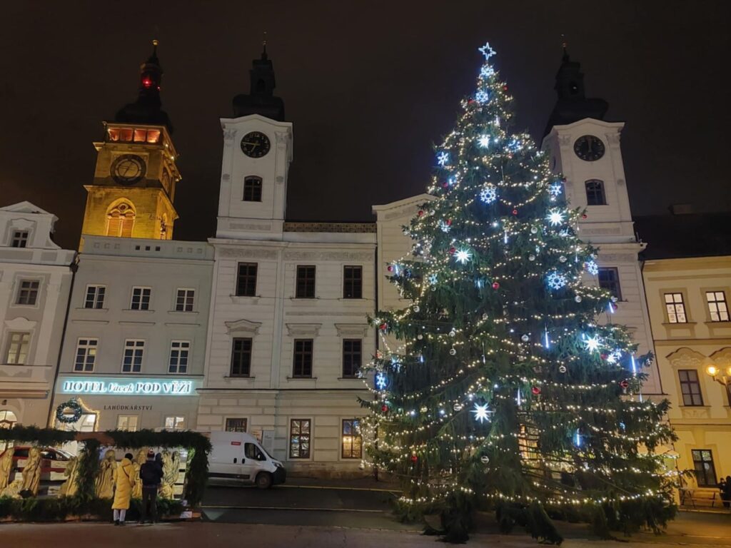 Druhý vánoční strom najdete tradičně na Masarykově náměstí. Letos ho zdobí zhruba šestnáct metrů vysoký smrk stříbrný, který čtyři desetiletí rostl v soukromém areálu v Opatovicích nad Labem. „Vzhledem k tomu, že jsme rodilí Hradečáci s kořeny na Masarykovo náměstí, tak víme o této krásné tradici darování pěkného stromu celá léta. Náš stál navíc v těsné blízkosti rodinné zástavby, kde by mohl při pádu někoho zranit. Nabídnout ho jako vánoční symbol tak pro nás bylo celkem jasné,“ prozradili už před převozem stromu manželé Andrýsovi. Také tento strom se poprvé rozzářil v neděli v 18 hodin. A přestože Masarykovo náměstí už několik let není centrem vánočních trhů, zastavit se u zdejšího vánočního stromu rozhodně stojí za to.