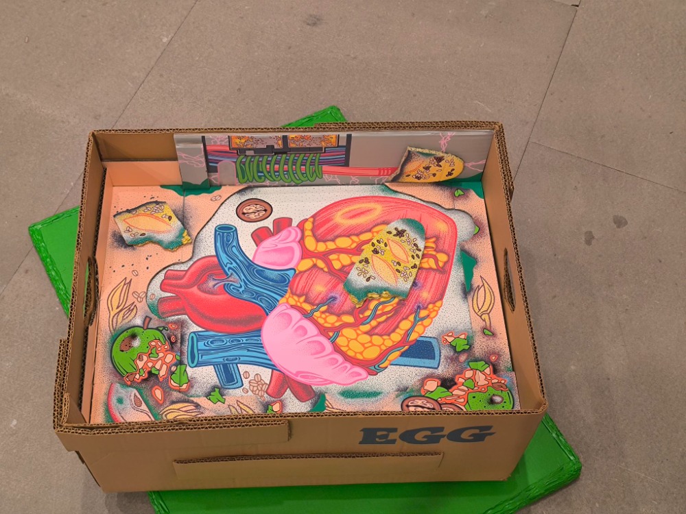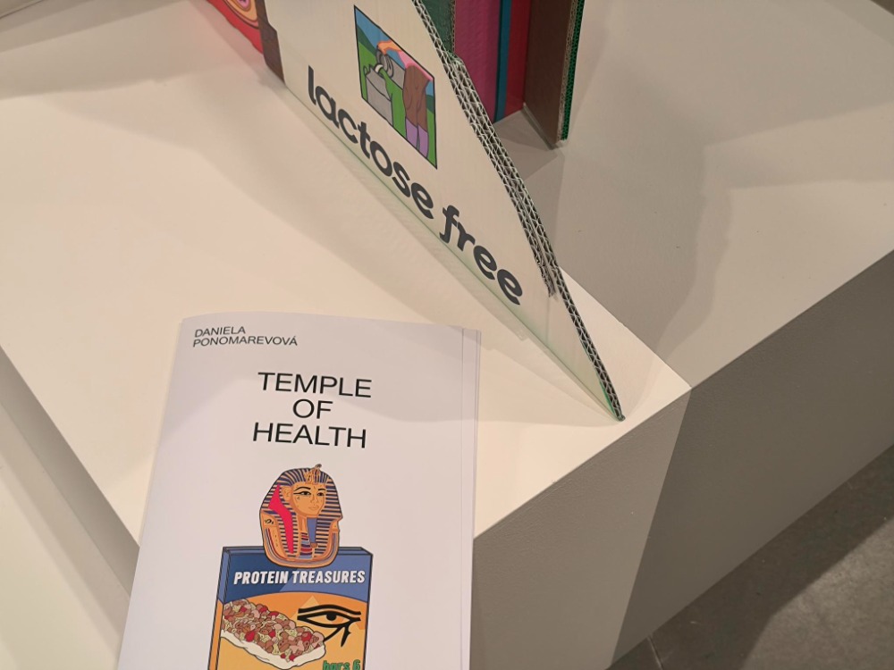 „Z kreseb a plošných motivů vytváří modulární prostorové objekty, připomínající scény či kulisy,“ řekla kurátorka. A to je také patrné na aktuální výstavě, kde Ponomarevová nainstalovala objekty s výraznou ikonografií. Chrám zdraví je vytvořený z krabice od televize, automat na brambory či bedna ukrývající lidské srdce. Všechny náměty umělkyně analyzovala v koncepčním skicáři, který se stává výchozím bodem pro tvorbu konkrétních děl. „Nejnovější dílo Temple of Health, které dalo název celé výstavě, tematizuje chrám jakožto prostor pro uctívání a zdraví jako současné téma,“ vysvětlila kurátorka. Obě výstavy v Galerii moderního umění potrvají do 11. ledna.