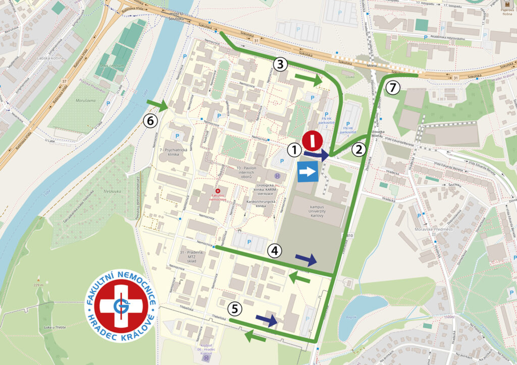 Vjezd do areálu zůstává možný přes nákladní vrátnici v ulici Zborovská nebo z ulice Třebešská za Vojenskou lékařskou fakultou. Zaměstnanci mohou využívat také vjezd směrem od Labe. Jak se do nemocnice dostat ve směru od soutoku, ukazuje také nové video FNHK.