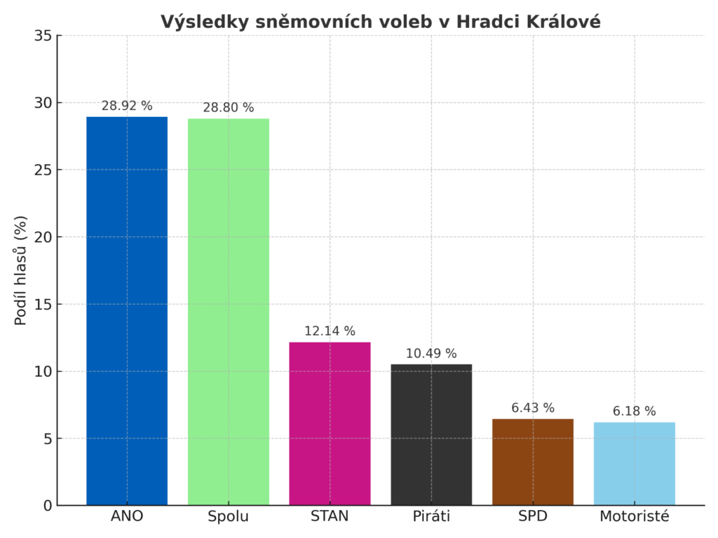 Sněmovní volby v Hradci Králové těsně vyhrálo hnutí ANO se ziskem 28,92 % před koalicí Spolu (28,80 %). V absolutních číslech činil rozdíl mezi prvními dvěma uskupeními pouhých 62 hlasů. Třetí skončilo hnutí STAN (12,14 %), na dvouciferný výsledek dosáhli i čtvrtí Piráti (10,49 %). Nad pět procent se v Hradci dostali ještě SPD (6,43 %) a Motoristé (6,18 %).