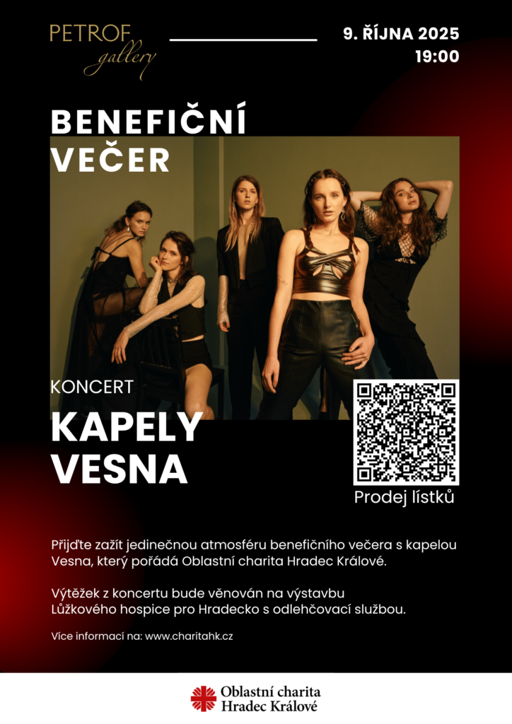 Nedávná Kamínková aukce vynesla více než 600 tisíc korun. Další možnost přispět budou mít lidé v neděli 31. srpna během dronové show a koncertu Tata Bojs v Parku 360, kde půjde hospic podpořit vhozením zálohovaného kelímku do sběrné nádoby u stánku charity. Velká benefiční akce je pak naplánovaná na čtvrtek 9. října – v Petrof Gallery se uskuteční koncert kapely Vesna. Celý výtěžek z večera bude věnován na dostavbu hospice. Koncert začíná v 19 hodin a vstupenky jsou už nyní v předprodeji na stránkách Petrof Gallery.