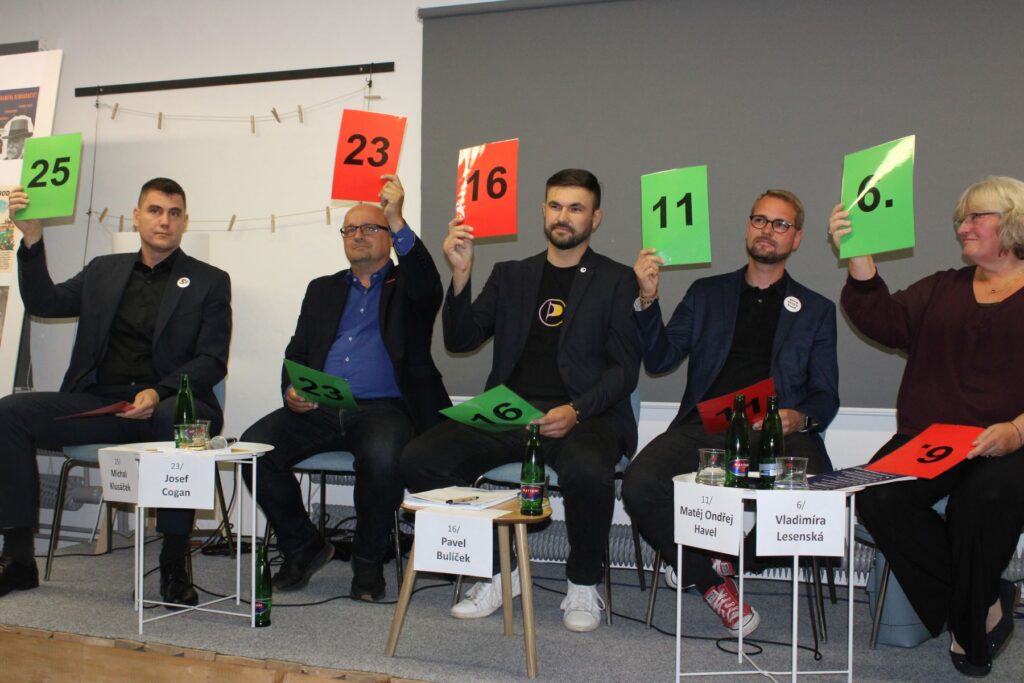 Ve čtvrtek 18. září uspořádaly Salonky ve spolupráci se Sítí aktivních občanů Hradec Králové a skupinou Milion chvilek Hradec Králové velkou předvolební debatu lídrů krajských kandidátek do nadcházejících voleb do Poslanecké sněmovny. Na debatu jsme pozvali lídry sedmi stran, hnutí a koalic, které podle volebního modelu agentury STEM pro Královéhradecký kraj mají reálnou šanci dostat se do Sněmovny. Debaty se zúčastnil lídr koalice Spolu Matěj Ondřej Havel, lídryně SPD Vladimíra Lesenská, krajský lídr STAN Josef Cogan, jednička kandidátky Pirátů Pavel Bulíček a volební lídr Stačilo! Michal Klusáček. Účast potvrdil i zástupce hnutí ANO Jiří Mašek, z debaty se však na poslední chvíli ze zdravotních důvodů omluvil. Pozvání opakovaně obdrželi také Motoristé, nicméně na něj nereagovali.
