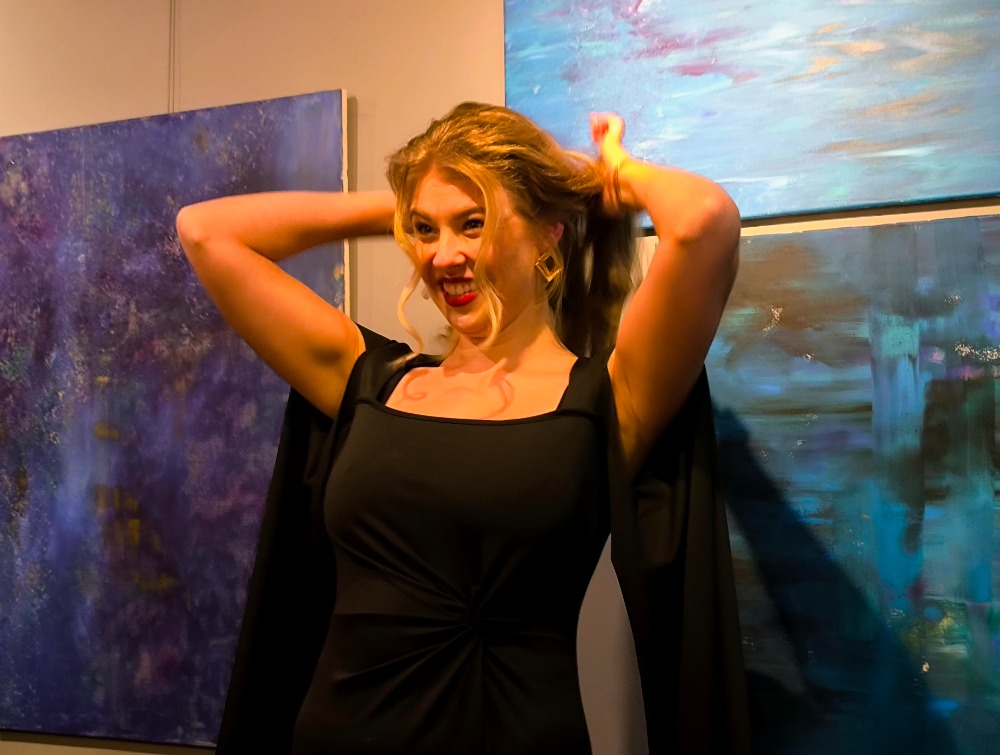 Jedním z takových obrazů je nepochybně akryl na plátně autorkou pojmenovaný Minuet Parlor, který čtyřiadvacetiletá malířka, jež ve své tvorbě ráda experimentuje s rozmanitými materiály, považuje za svůj velmi oblíbený. „Ano, mám ho moc ráda. Na platně se v různých pozicích pohybují tanečníci a tanečnice. Je to takový výtvarný parket, stačí se jen dívat a hledat,“ řekla ke svému letošnímu dílu Tereza.