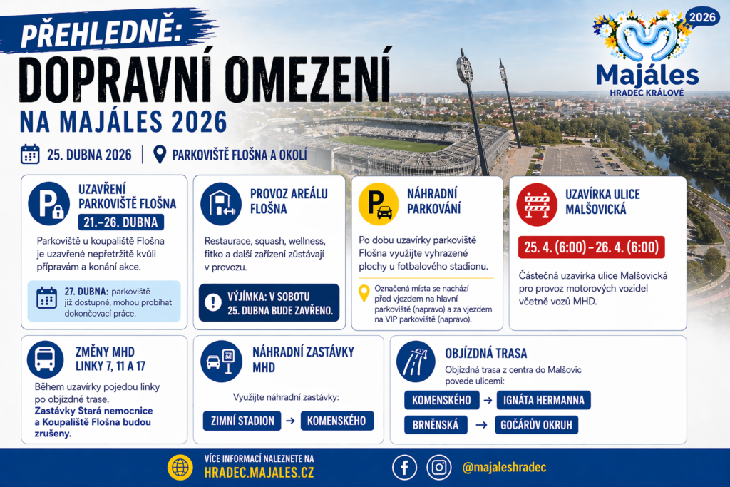 V den konání Majálesu, tedy v sobotu 25. dubna, se pak připravte i na omezení přímo v ulicích. Od 6:00 bude na 24 hodin částečně uzavřená ulice Malšovická, a to včetně provozu MHD. Objízdná trasa z centra povede přes ulice Komenského, Ignáta Hermanna, Brněnskou a přes Gočárův okruh.