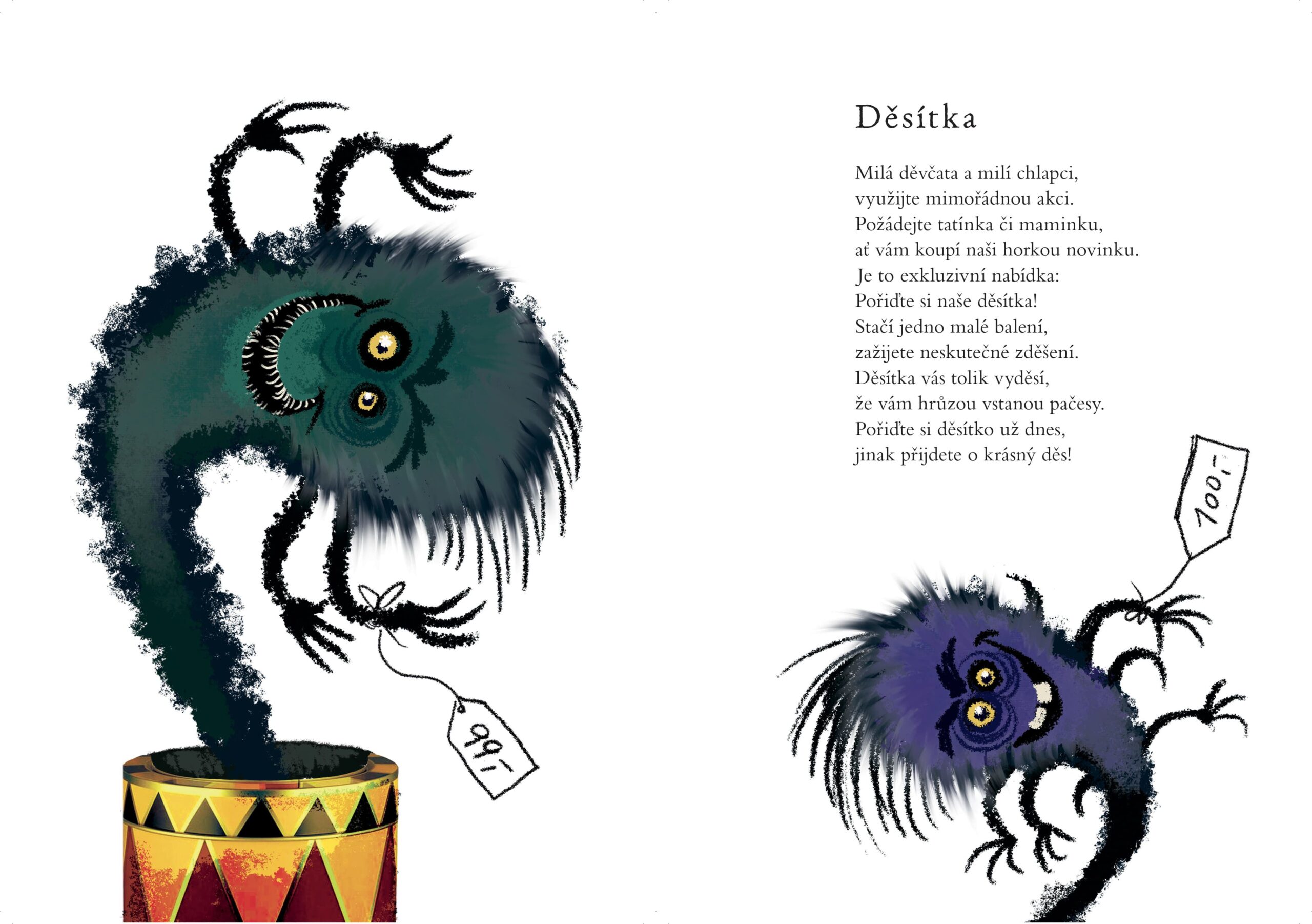 Sbírka otevírá bránu do světa dětské fantazie, kde spolu žijí zvířata, věci, strašidýlka i písmena – a všechno tu funguje tak trochu naruby. Děsítka, mňoukalín, loudalka nebo bubák zažívají bláznivá dobrodružství, která pobaví i dospělé, kteří si rádi připomenou hravost dětských let. Knihu doprovodila ilustracemi výtvarnice a držitelka Českého lva Denisa Grimmová, která do poezie přináší barevnost, vtip i nečekanou něhu.