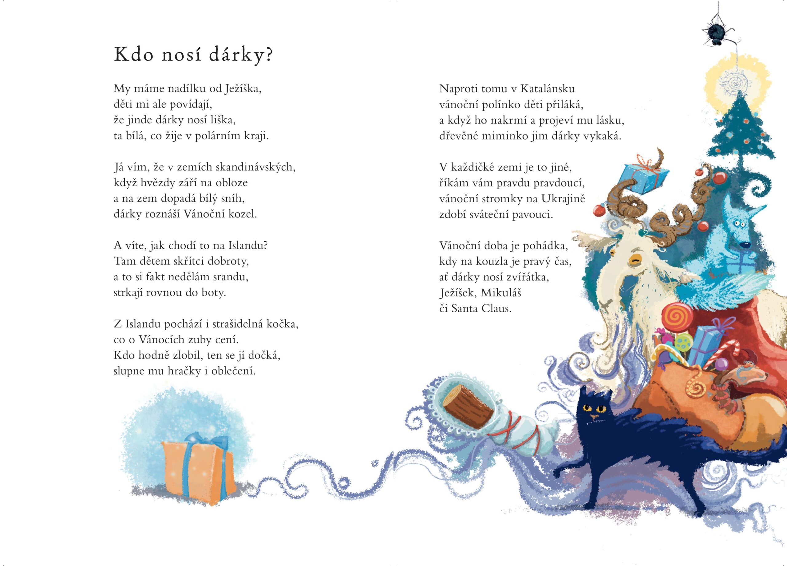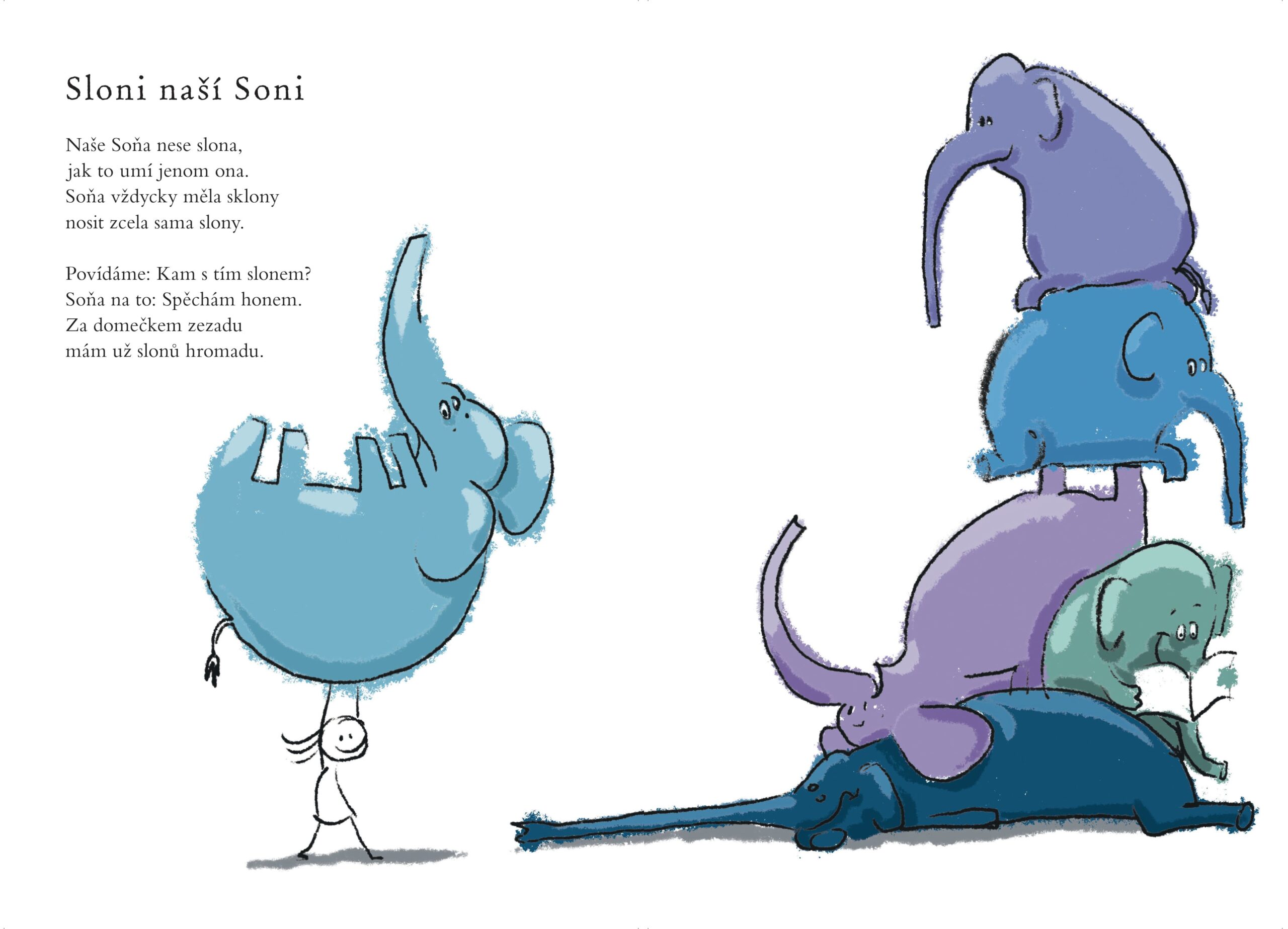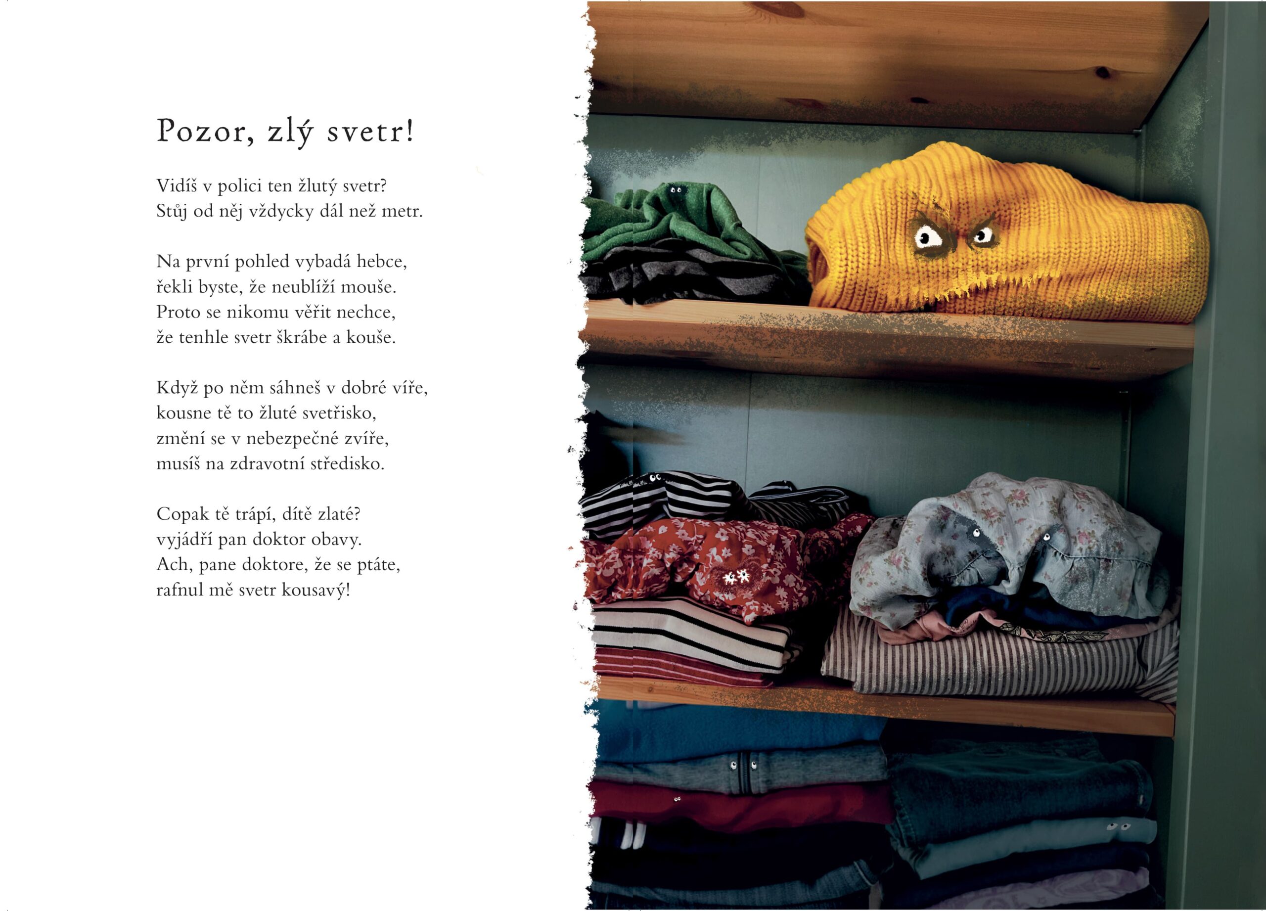 Mezi rozvernými verši nechybí básničky s názvy jako Ovocné StarDance, Sloni naší Soni, Mouchysněztesimě nebo Pozor, zlý svetr!. Některé z nich si našly cestu i na YouTube, kde vznikla videa v recitaci známých herců – například Kdo nosí dárky? s Antonínem Janem Abrhámem nebo Bubák ze šuplíku s Magdalenou Hubáčkovou.