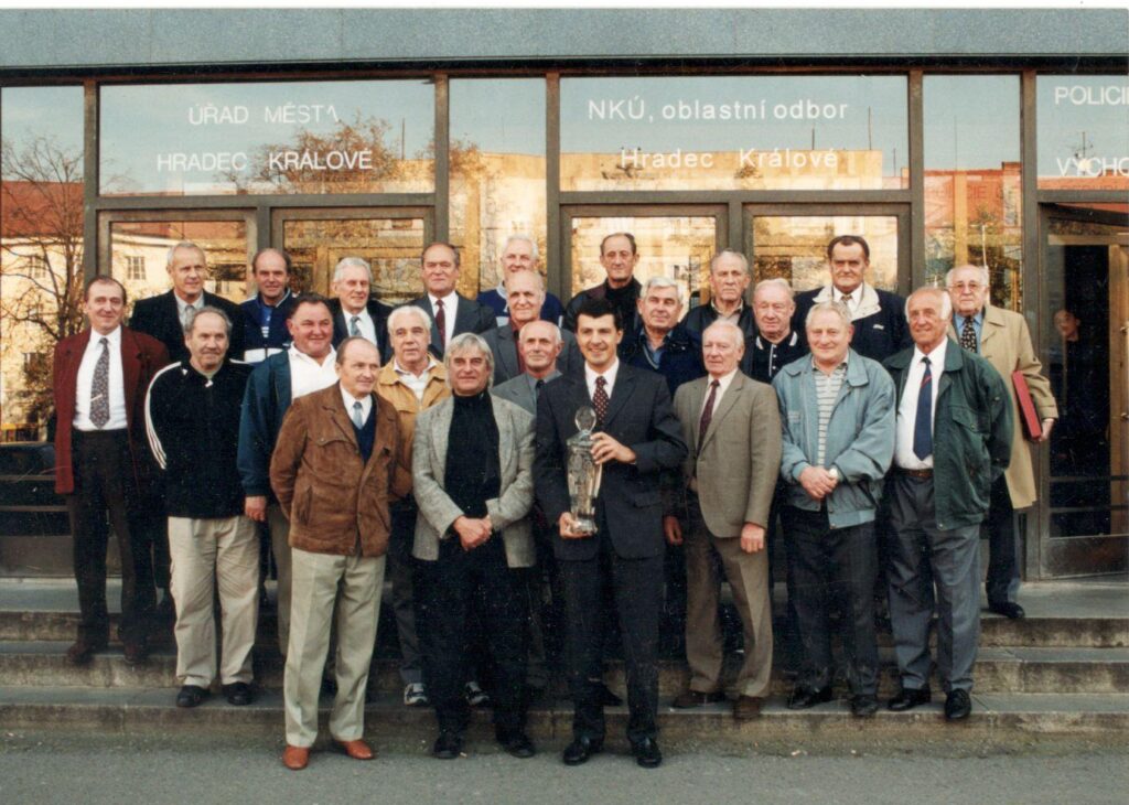 Na fotce jsou bývalí fotbalisté Spartaku Hradec Králové, kteří se sešli po 40 letech od získání mistrovského titulu na hradecké radnici, kam je pozval v roce 2000 primátor města Hradec Králové Oldřich Vlasák.