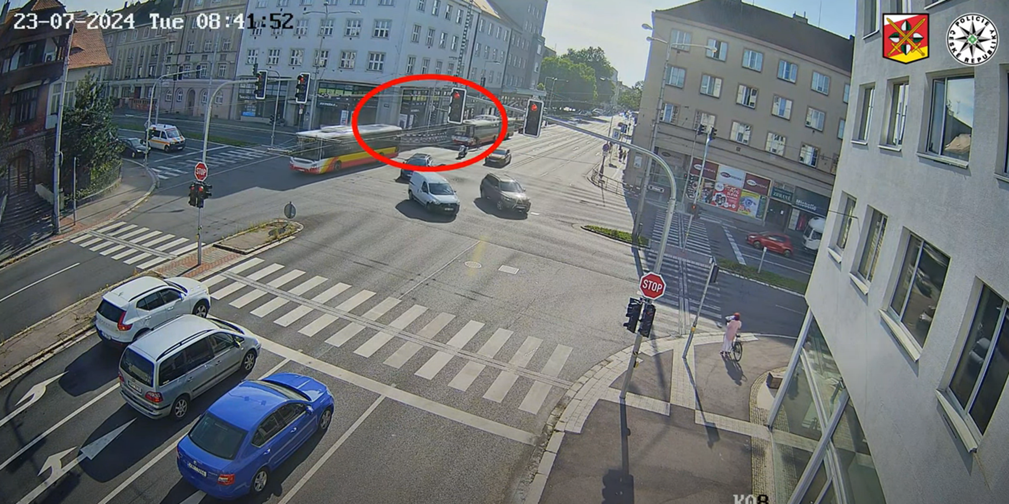 Ve středu po poledne vydala k nehodě zprávu i Policie ČR. Hradečtí policisté uvedli, že cyklista jel od Ulrichova náměstí v levém jízdním pruhu, který je pro odbočení vlevo. Na poslední chvíli se však přímo v křižovatce náhle rozhodl odbočit vpravo, čímž jel do jízdní dráhy souběžně jedoucímu trolejbusu, který jel rovně z Ulrichova náměstí směrem ke křižovatce Koruna. "Řidička trolejbusu, aby se vyhnul střetu, prudce zabrzdila, čímž došlo k pádu několika cestujících. Čtyřiašedesátiletá žena a devítiletý chlapec byli převezeni do nemocnice na ošetření. Nikdo jiný zraněn nebyl. Ke střetu místa nedošlo a cyklista z nehody ujel, aniž by učinil opatření daná mu zákonem U řidičky trolejbusu byl alkohol vyloučen dechovou zkouškou Hmotná škoda nevznikla,“ popsala událost mluvčí hradeckých policistů Iva Kormošová.